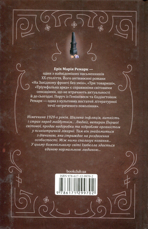 Еріх Марія Ремарк - один з найвідоміших письменників ХХ століття. Його антивоєнні романи 'На Західному фронті без змін', 'Три товариші', 'Тріумфальна арка' є справжніми світовими сенсаціями, що не втрачають актуальності й донині. Поруч із Гемінґвеєм та Олдінґтоном Ремарк - одна з культових постатей літературної течії 'втраченого покоління'.