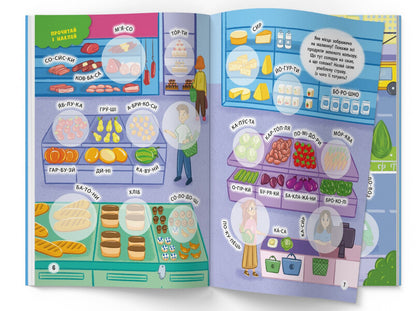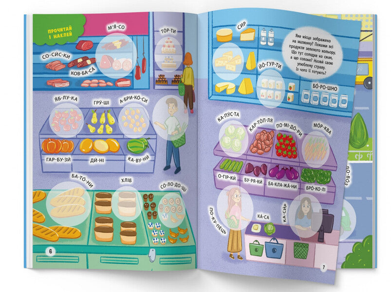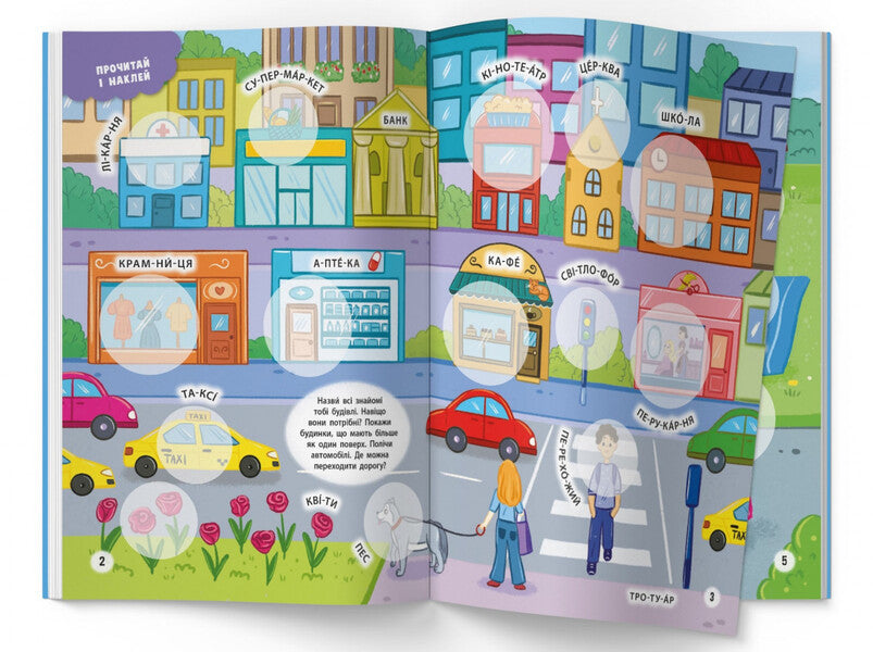 Розглядаючи яскраві картинки й читаючи підписи до них, малюк буде знайомитися з новими словами й основами складоподілу, а наклеючи наліпки — поліпшувати дрібну моторику пальчиків.