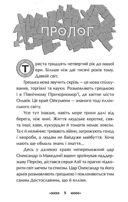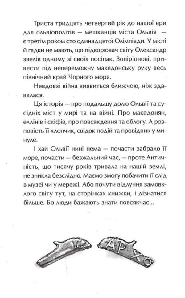 Мешканці Ольвії, міста, розташованого біля Чорного моря, і гадки не мають, що вже віддано наказ привести під непереможну македонську руку весь північний край. Отож, війна… Ця історія — про подальшу долю міста та його мешканців і сусідів. Про македонян, еллінів та скіфів, про повсякдення й облогу. А розповідає її хлопчик, свідок подій та провідник у минуле. І хай Ольвії нині нема — її забрали море та безжальний час, — проте античність не зникла. Маємо змогу побачити її слід, почути відлуння замовклого світу і дізнатися більше. Бо люди прагнуть знати повсякчас.