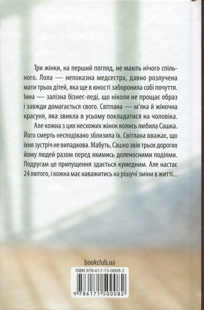 Але кожна з цих несхожих жінок колись любила Сашка. Його смерть несподівано зблизила їх. Світлана вважає, що їхня зустріч не випадкова. Мабуть, Сашко звів трьох дорогих йому людей разом перед якимись доленосними подіями. Подругам це припущення здається кумедним. Але настає 24 лютого, і кожна має наважитись на рішучі зміни в житті...