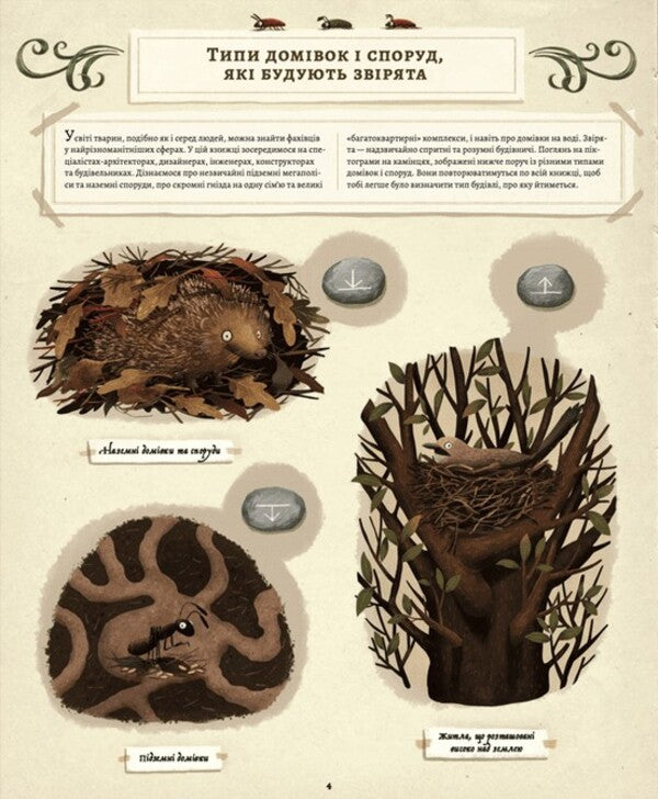 Виявляється, і серед тварин є дизайнери, інженери, конструктори, будівельники та справжні архітектори. У чудово проілюстрованій книжці Емілії Дзюбак дізнаєтеся про справжні підземні мегаполіси та наземні споруди, невеличкі гніздечка та 'багатоквартирні' комплекси, будиночки на воді та під водою, переносні й тимчасові житла. Усі ці споруди – справа рук звірят, птахів та комах – справжніх майстрів-будівничих, які добре знаються на будівельних матеріалах, безпеці та затишку власних помешкань. Для усіх, хто цікавиться світом тварин та природою.