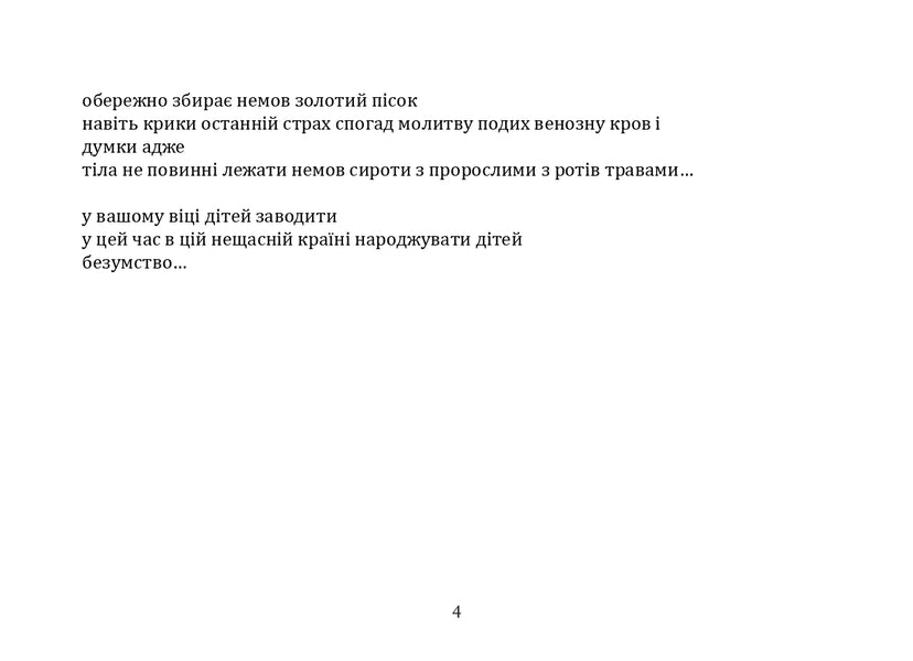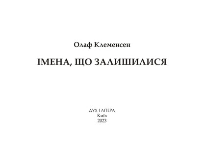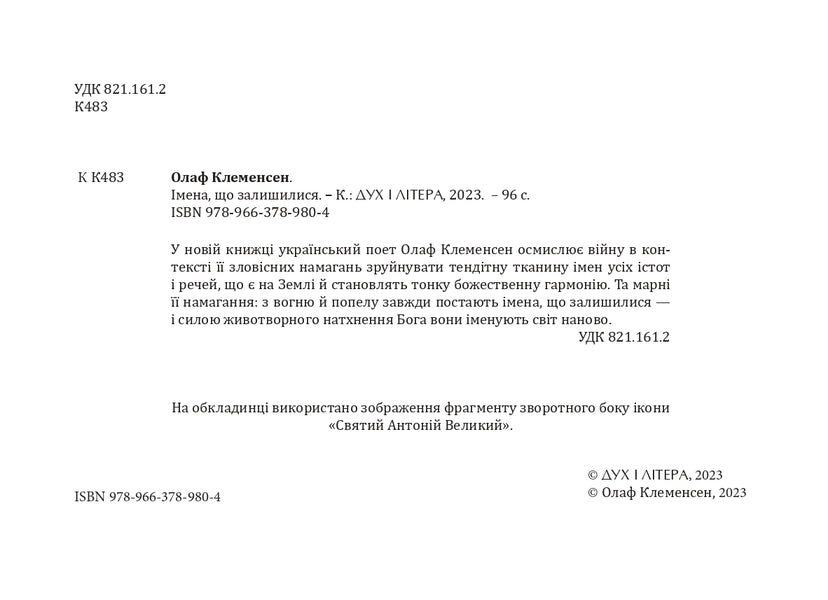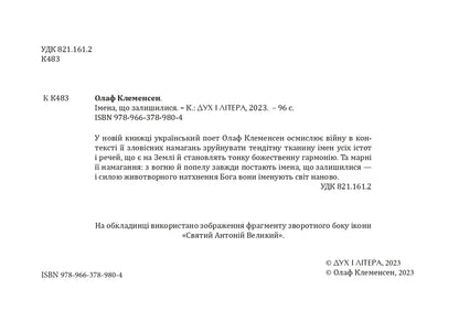 У новій книжці український поет Олаф Клеменсен осмислює війну в контексті її зловісних намагань зруйнувати тендітну тканину імен усіх істот і речей, що є на Землі й становлять тонку божественну гармонію. Та марні її намагання: з вогню й попелу завжди постають імена, що залишилися — і силою животворного натхнення Бога вони іменують світ наново.