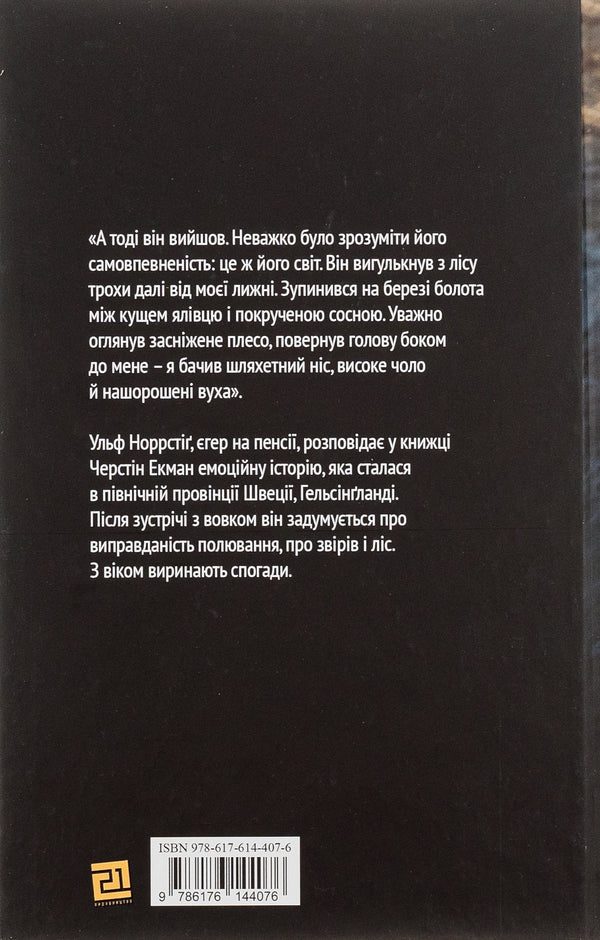Ульф Норрстіґ, єгер на пенсії, розповідає у книжці Черстін Екман емоційну історію, яка сталася в північній провінції Швеції, Гельсінґланді. Після зустрічі з вовком він задумується про виправданість полювання, про звірів і ліс. З віком виринають спогади.