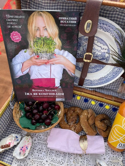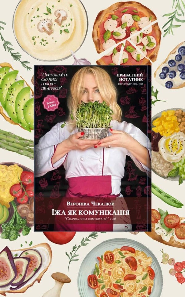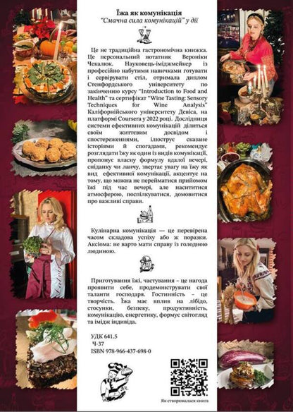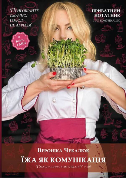 Вероніка Чекалюк – дипломований кухар-любитель зі стажем, кулінар-експериментатор, кандидат наук із соціальних комунікацій, журналіст, публіцист. Така освіта й практичний досвід – ідеальне поєднання для створення книги-путівника у світі ефективних комунікацій. Вероніка доводить, що їжа, трапеза є об’єктом комунікацій.