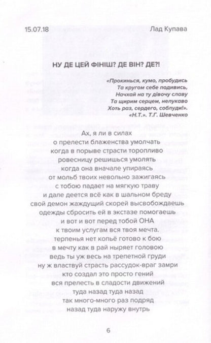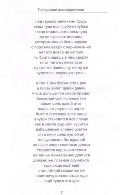 Буколіки — жанр пастушої пісні про любов, коріння якого сягає часів давньогрецького поета Теокрита. Українські інтимні 'буколіки' автора й одночасно головного героя це відверті спогади про те, як підліток поступово ставав чоловіком, про статеві особливості та інтимні таємнички юнака. Не обходили головного героя й питання вибору сексуальної орієнтації. Також автор відтворює картини життя в далекі радянські часи, де писати про подібне вважалось аморальним, й радіє, що його не 'осусідили' і він може писати вірші рідною мовою.