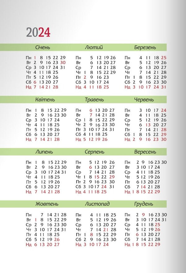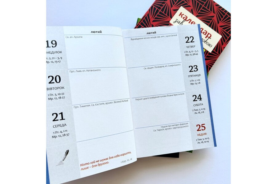 Календар на 2024 рік “Завжди з тобою” може стати твоїм найкращим помічником у плануванні справ та у щоденній молитві: кишеньковий формат, кольорові сторінки, кожен тиждень на окремому розвороті, місце для записів, позначені свята та щоденні літургійні читання. Щотижня – цитата з Послань апостола Павла, яка супроводжуватиме тебе посеред буденної метушні. А в кінці – кілька сторінок зі щоденними молитвами та молитвами на різні потреби, для того, щоб ти міг помолитися будь-де – в маршрутці, на робочому місці, в часі прогулянки в парку. Даруємо тобі три в одному – планер, літургійний календар та міні-молитовник – зручно і завжди з тобою!