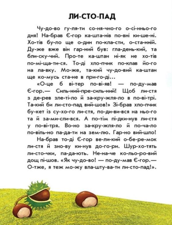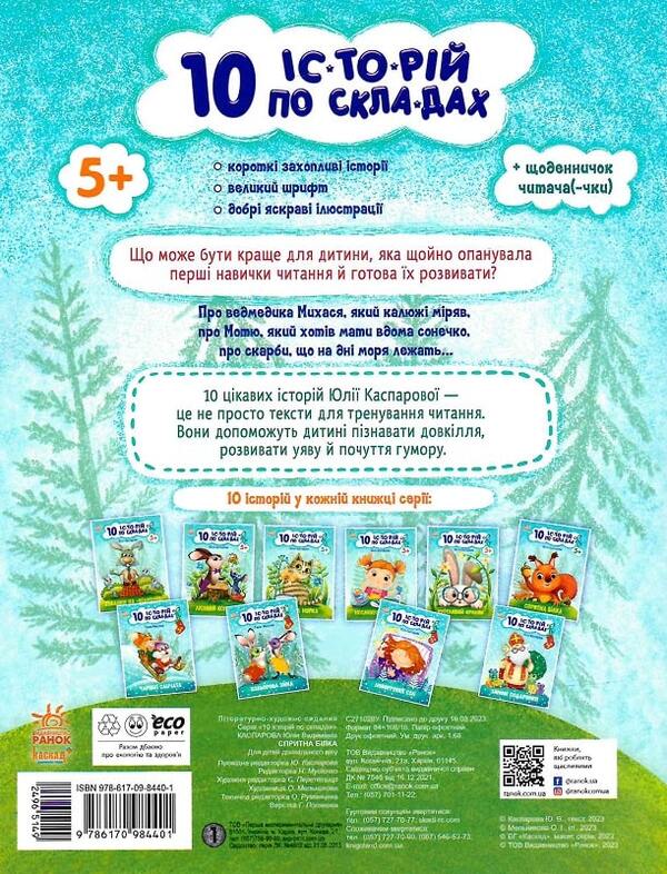 '10 історій по складах' — серія захопливих різдвяно-новорічних книг із короткими текстами для тренування читання. Усі слова в книгах подані великим шрифтом і поділені на склади. Так читачеві-початківцю буде легше розвивати нове вміння. Разом із цікавими зимовими історіями та добрими яскравими ілюстраціями дитина пізнаватиме навколишній світ, розвивати мислення, фантазію, почуття гумору та, звісно ж, навички читання. Видання призначене для дітей старшого дошкільного та молодшого шкільного віку.