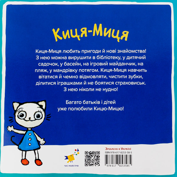Киця-Миця любить пригоди й нові знайомства! З нею можна вирушити в бібліотеку, у дитячий садочок, у басейн, на ігровий майданчик, на пляж, у мандрівку потягом. Киця-Миця навчить вітатися і чемно відмовляти, чистити зубки, ділитися іграшками й не боятися страховиськ. З нею ніколи не нудно!