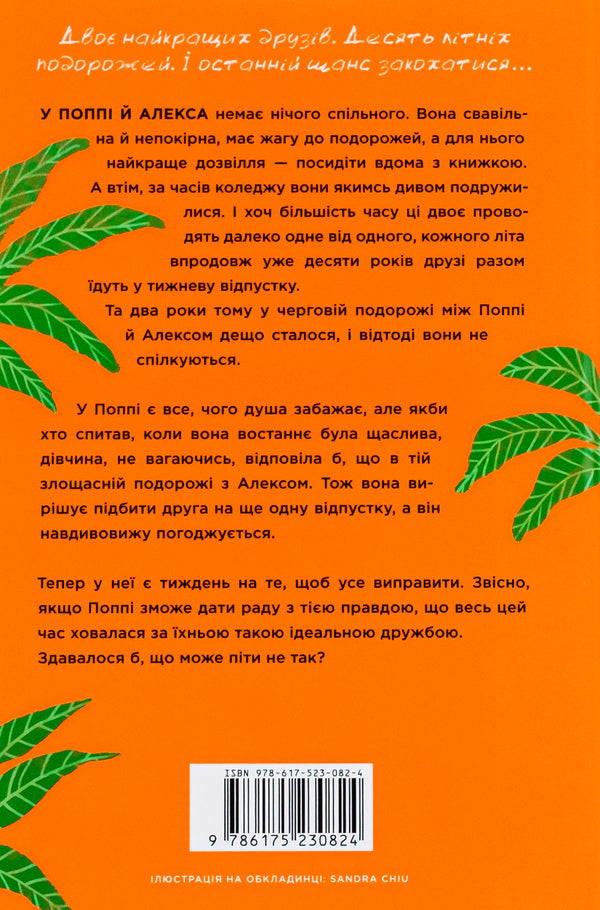 У Поппі й Алекса немає нічого спільного. Вона свавільна й непокірна, має жагу до подорожей, а для нього найкраще дозвілля — посидіти вдома з книжкою. А втім, за часів коледжу вони якимсь дивом подружилися. І хоч більшість часу ці двоє проводять далеко одне від одного, кожного літа впродовж уже десяти років друзі разом їдуть у тижневу відпустку.