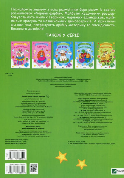 Познайомте малечу з усім розмаїттям барв разом із серією розмальовок 'Чарівні фарби'. Майбутні художники розфарбовуватимуть милих тваринок, чарівних єдиноріжок, мрійливих красунь та незвичайних динозавриків. А приклеївши наліпки, потренують дрібну моторику та посидючість. Веселого дозвілля!
