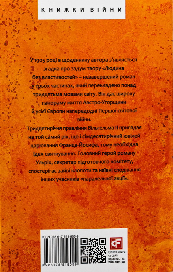 Роберт Музіль (1880–1942) — австрійський есеїст і письменник, драматург, театральний критик, класик австрійського модернізму. Доктор філософії Гумбольдтівського університету в Берліні. У 1905 році в щоденнику автора з’являється згадка про задум твору 'Людина без властивостей' — незавершений роман у трьох частинах, який перекладено понад тридцятьма мовами світу. Він дає широку панораму життя Австро-Угорщини й усієї Європи напередодні Першої світової війни.