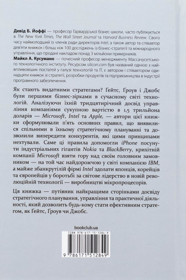 Як стають видатними стратегами? Ґейтс, Ґроув і Джобс були першими 'бізнес-зірками' у сучасному світі технологій. Аналізуючи їхній тридцятирічний досвід управління компаніями сукупною вартістю в 1,5 трильйона доларів — Microsoft, Intel та Apple, — автори цієї книжки сформулювали п’ять основних правил, що виявилися спільними у стратегічному плануванні цих гігантів ринку та дозволили випередити конкурентів, які цими принципами нехтували. Саме ці правила допомогли стільниковому телефону iPhone далеко посунути індустріальних гігантів Nokia та BlackBerry, крихітній компанії Microsoft із Сіетла взяти гору над своїм головним замовником — на той час найдорожчою у світі компанією IBM, а майже збанкрутілій фірмі Intel здолати японців, корейців та європейців у боротьбі за світове лідерство в новій революційній технології — виробництві мікропроцесорів.