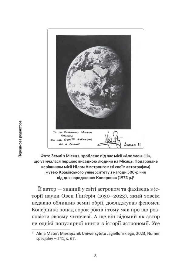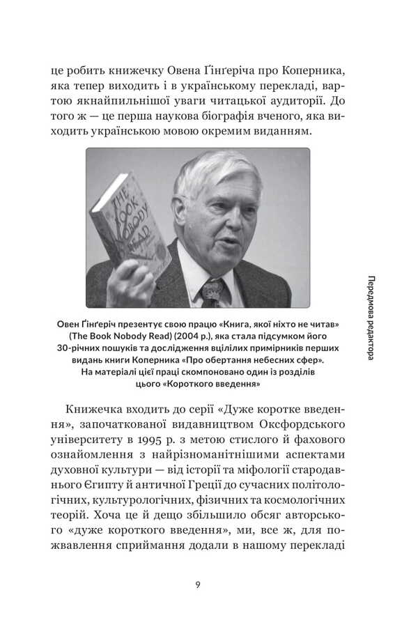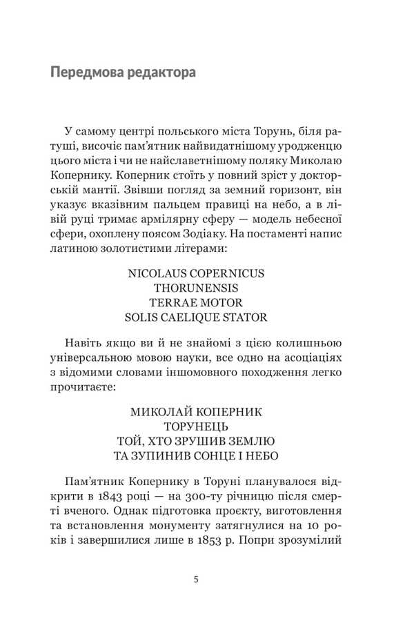 Книжечка, яка пропонується читачеві, може служити першою сходинкою для осягнення цієї глибокої й далекосяжної істини. І хоча вона є лише 'дуже коротким уведенням', проте фундаментальні знання і компетенції її автора, визнаного у світі дослідника в галузі історії науки, і його популяризаторський хист послужать надійною запорукою вашого успіху. Крім того, книжечка розповість і про найголовніші віхи в реальному житті Коперника в підмісячному світі, тобто в його соціумі поза межами астрономії. Тим вона збагатить ваш духовний досвід і дасть живильну силу для власних роздумів.
