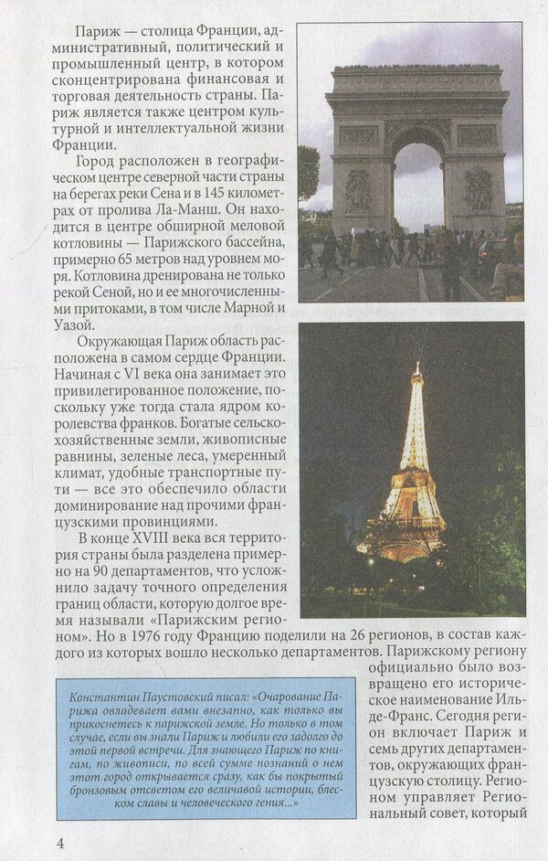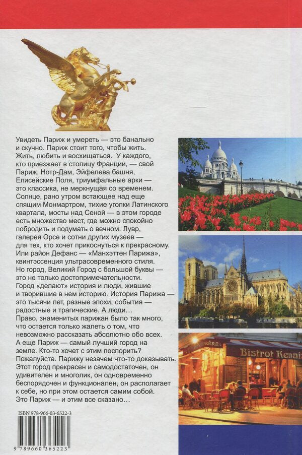 Увидеть Париж и умереть - это банально и скучно. Париж стоит того, чтобы жить. Жить, любить и восхищаться. У каждого, кто приезжает в столицу Франции - свой Париж. Нотр- Дам, Эйфелева башня, Елисейские Поля, триумфальные арки - это классика, не меркнущая со временем. Солнце, рано утром встающее над еще спящим Монмартром, тихие уголки Латинского квартала, мосты над Сеной - в этом городе есть множество мест, где можно спокойно побродить и подумать о вечном. Лувр, галерея Орсе и сотни других музеев - для тех, кто хочет прикоснуться к прекрасному. Или район Де-фанс - 'Манхэттен Парижа', квинтэссенция ультрасовременного стиля.