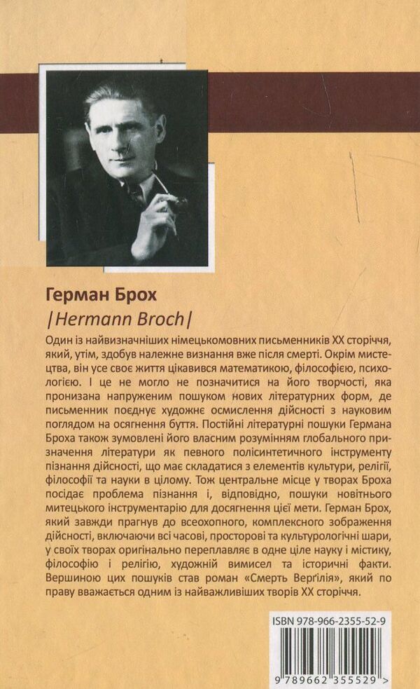 Герман Брох (1886–1951), поряд із Францом Кафкою та Робертом Музілем, належить до трійціна йвизначніших австрійських письменників ХХ ст. Цей видатний представник філософської прози не дістав достатнього визнання за життя і лише згодом увійшов в історію європейської літератури. 'Смерть Верґілія' – вершинне досягнення Броха, твір хрестомат ійний. До цього роману, позначеного впливом поетики Дж. Джойса, письменник ішов усе своє життя. Після публікації першого – англійського – перекладу 'Смерти Верґілія' сам Брох назвав свій роман 'майже неперекладним'. Це – розповідь про останні вісімнадцять годин життя смертельно хворого автора 'Енеїди', який перший у світовій літератур і провістив прихід Бога Ісуса й настання християнсько ї доби. Верґілій проводить ніч і частину дня у роздумах і спогадах, що їх змінюють напівмаренні видіння, переглядає пройдений шлях, переоцінює доти непорушні засади.