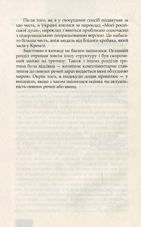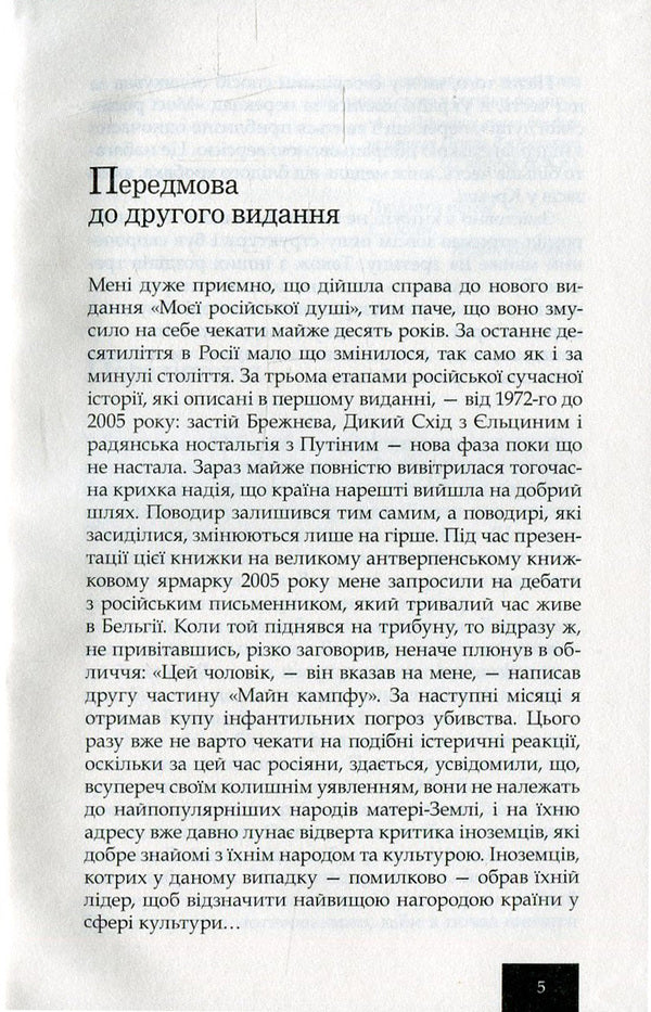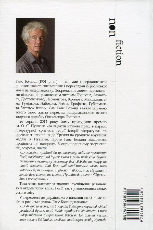 У своїй книжці 'Моя російська душа' відомий нідерландський філолог-славіст, письменник і перекладач із російської мови на нідерландську Ганс Боланд змальовує своє бачення колишньої та сучасної Росії. Спираючись на досвід проживання спочатку у Вологді за часів горбачовської перебудови, а відтак - у Санкт-Петербурзі першої половини буремних 90-х та подорожі в середині 2000-х, він описує Росію і росіян з погляду іноземця, представника зовсім іншого культурного базису й водночас із погляду перекладача, який завдяки своїй праці мав змогу глибоко проникнути в те, що називають 'загадковою російською душею'. Врешті-решт, він описує Росію як людина, котра споглядає, розуміє і усвідомлює ту прірву, в яку знову і знову бездумно і приречено поринає російське суспільство на своєму непевному шляху, де так легко можна втратити навіть 'російську душу'.