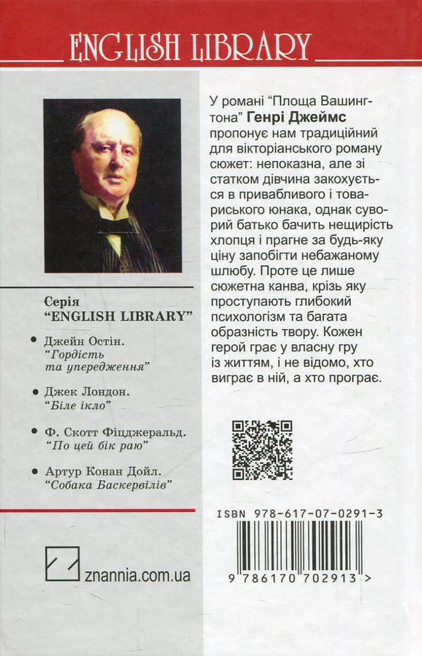 У романі 'Площа Вашингтона' Генрі Джеймс (1843—1916) пропонує нам традиційний для вікторіанського роману сюжет: непоказна, але зі статком дівчина закохується в привабливого і товариського юнака, однак суворий батько бачить нещирість хлопця і прагне за будь-яку ціну запобігти небажаному шлюбу. Проте це лише сюжетна канва, крізь яку проступають глибокий психологізм та багата образність твору. Кожен герой грає у власну гру із життям, і не відомо, хто виграє в ній, а хто програє.