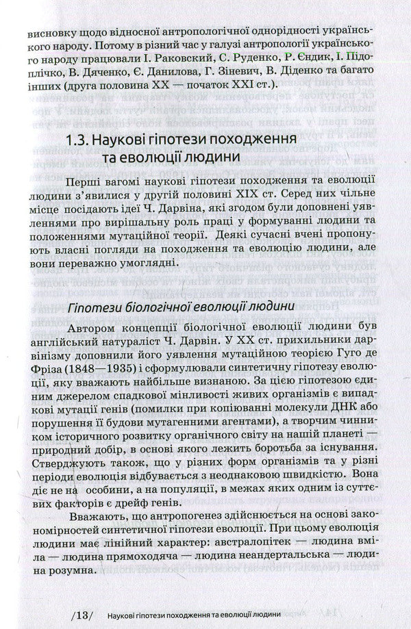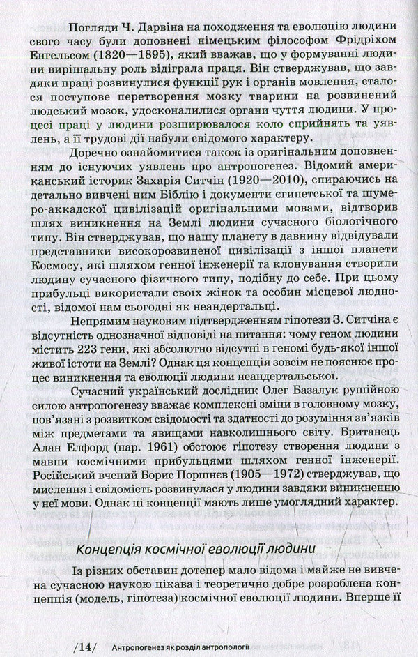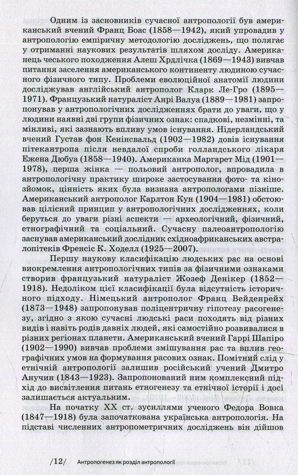 Антропогенез як науковий підрозділ антропології вивчає походження та еволюцію людини. Сучасні антропологічні дослідження, молекулярно-генетичне розшифрування геному людини переконують, що антропогенез не був лінійним та односпрямованим, а мав розгалужений характер із численними паралелізмами, тупиковими лініями й мозаїчним розподілом ознак. Доведено, що неандертальці є не предками людини, а спорідненим видом із спільним з нею предком — людиною гейдельберзькою, а раси сучасної людини — не окремі види, а різновиди одного біологічного виду Ноmо sаріеns. Матеріал підручника розкриває розвиток уявлень про походження та еволюцію людини, специфіку методів антропологічних досліджень, обґрунтовує генетичні аспекти антропогенезу, а також розгортання, механізми та чинники расогенезу.
