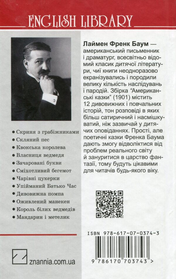 Лаймен Френк Баум (1856—1919) — американський письменник і драматург, всесвітньо відомий класик дитячої літератури, чиї книги неодноразово екранізувались і породили велику кількість наслідувань і пародій. Збірка “Американські казки” (1901) містить 12 дивовижних і повчальних історій, тон розповіді в яких більш сатиричний і насмішкуватий, ніж зазвичай у дитячих оповіданнях. Прості, але поетичні казки Френка Баума дають змогу відволіктися від проблем реального світу й зануритися в царство фантазії, тому будуть цікавими для читачів будь-якого віку.