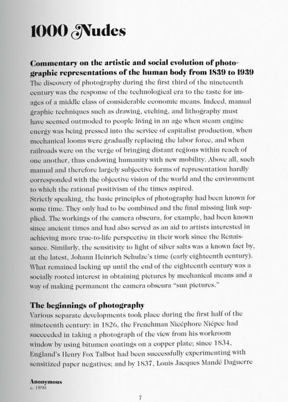 1000 Nudes offers a cross-section of the history of nude photography, ranging from the earliest nude daguerrotypes and ethnographic nude photographs to experimental nude photography. The period of time spanned by this work is from 1839 to roughly 1939, from the medium’s infancy to the end of the classic modernist period. Content-wise, the book pays tribute to the full range of pictorial approaches, from the manually elaborated artistic nudes of the turn of the century, enveloped in layers of theory, to the “obscene” postcard motifs which had not the slightest artistic pretension and were intended to exert a maximum effect on the buyer’s wallet.