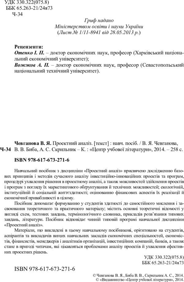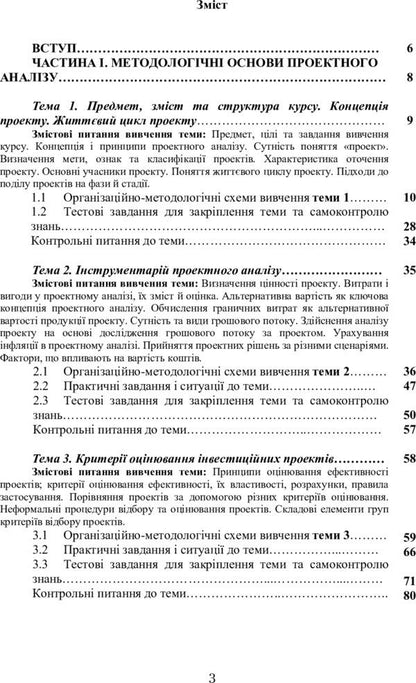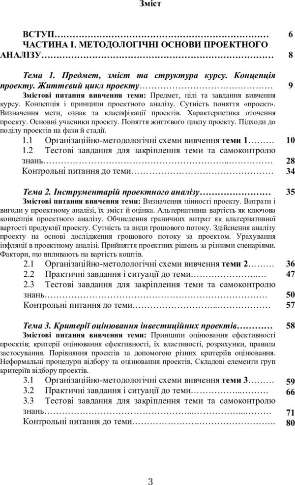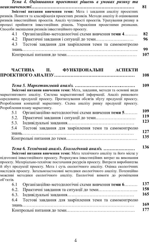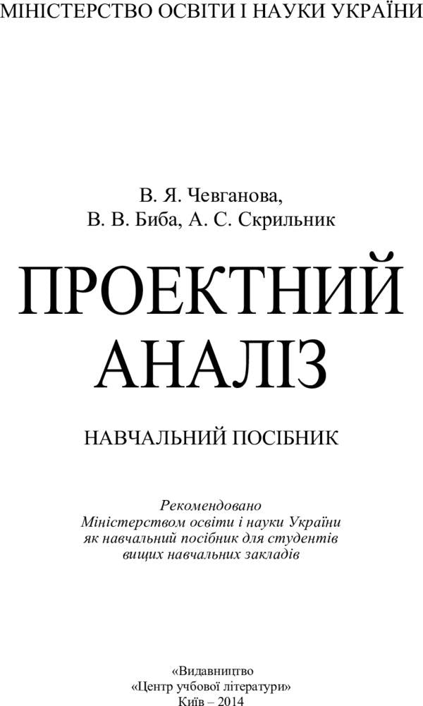 Навчальний посібник з дисципліни 'Проектний аналіз' присвячено дослідженню базових принципів і методів сучасного аналізу інвестиційно-інноваційних проектів та програм, процедурі ухвалення рішення в проектному аналізі, а також можливостей здійснення проектів і програм з погляду їх маркетингового обґрунтування й технічних можливостей, екологічній, інституційній й соціальній життєздатності, оцінюванню фінансових аспектів їх реалізації й економічної привабливості в цілому. Посібник допомагає формуванню у студентів здатності до самостійного мислення і за- своювання теоретичного та практичного матеріалу, містить основні теоретичні відомості у вигляді схем, тестових завдань, термінологічного словника, прикладів розв’язання типових завдань, літератури. Посібник відповідає чинній типовій програмі навчальної дисципліни 'Проектний аналіз'. Матеріали, що викладені в цьому навчальному посібникові, орієнтовано на студентів, аспірантів та викладачів вищих навчальних закладів економічних спеціальностей, економістів, фінансистів, менеджерів і аналітиків організацій, інвестиційних компаній, банків, а також стане в пригоді читачам, які цікавляться проблемами аналізу проектів й ухвалення ефективних проектних рішень.
