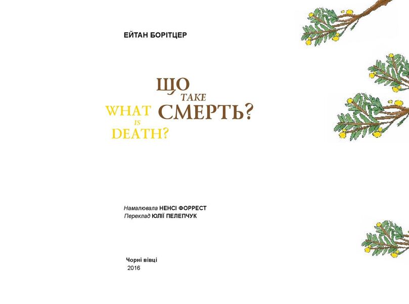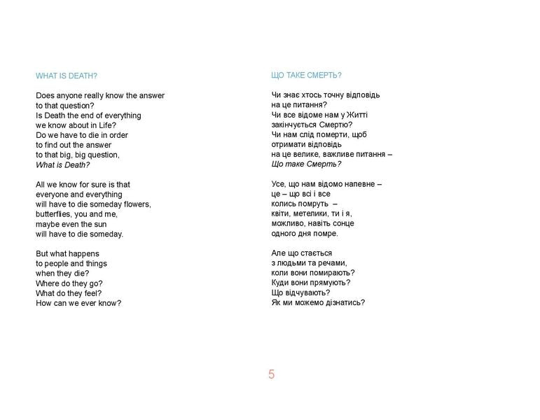 'Що таке Смерть?' – третя книга популярної серії 'Що таке?' ('What is?') адресована дітям, батькам і педагогам. Торкається природної дитячої цікавості до цієї складної теми. Ознайомлюючи із загальними уявленнями про поняття смерті, автор схиляє читача до реального розуміння питання, але в дуже м’який спосіб. Книга стане в пригоді дорослим та дітям для відкритого обговорення цієї таємничої теми, до якої майже кожен з нас починає відчувати інтерес ще у ранні роки життя. Відверта й підбадьорлива, звертаючись до позитиву життя, книга 'Що таке Смерть?' стала загальним вибором для багатьох фахівців з підтримки дітей, котрі переживають горе і втрату.