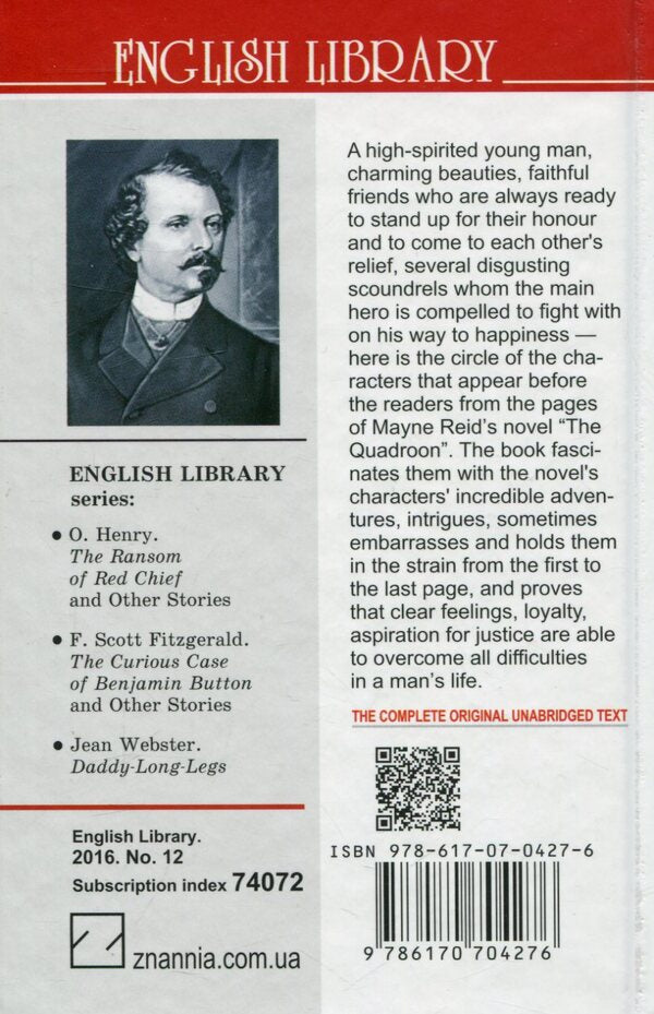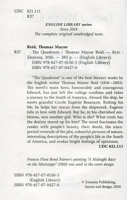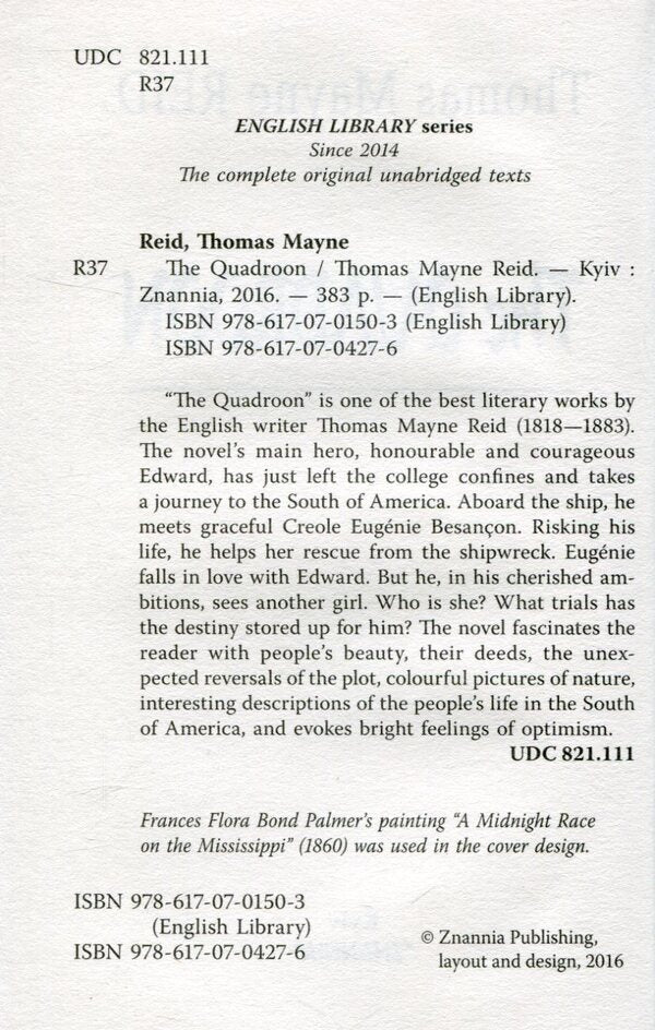 “The Quadroon” is one of the best literary works by the English writer Thomas Mayne Reid (1818—1883). The novel’s main hero, honourable and courageous Edward, has just left the college confines and takes a journey to the South of America. Aboard the ship, he meets graceful Creole Eugйnie Besanзon. Risking his life, he helps her rescue from the shipwreck. Eugйnie falls in love with Edward. But he, in his cherished ambitions, sees another girl. Who is she? What trials has the destiny stored up for him? The novel fascinates the reader with people’s beauty, their deeds, the unexpected reversals of the plot, colourful pictures of nature, interesting descriptions of the people’s life in the South of America, and evokes bright feelings of optimism.