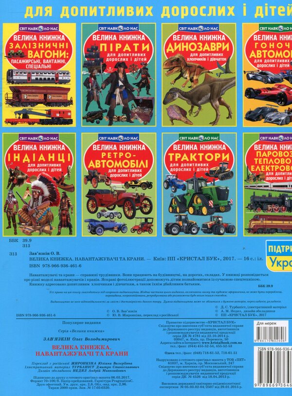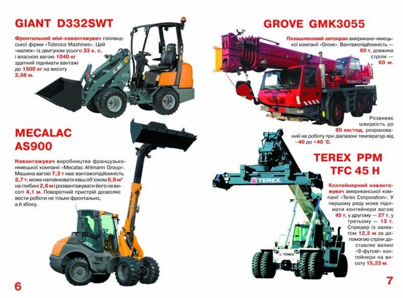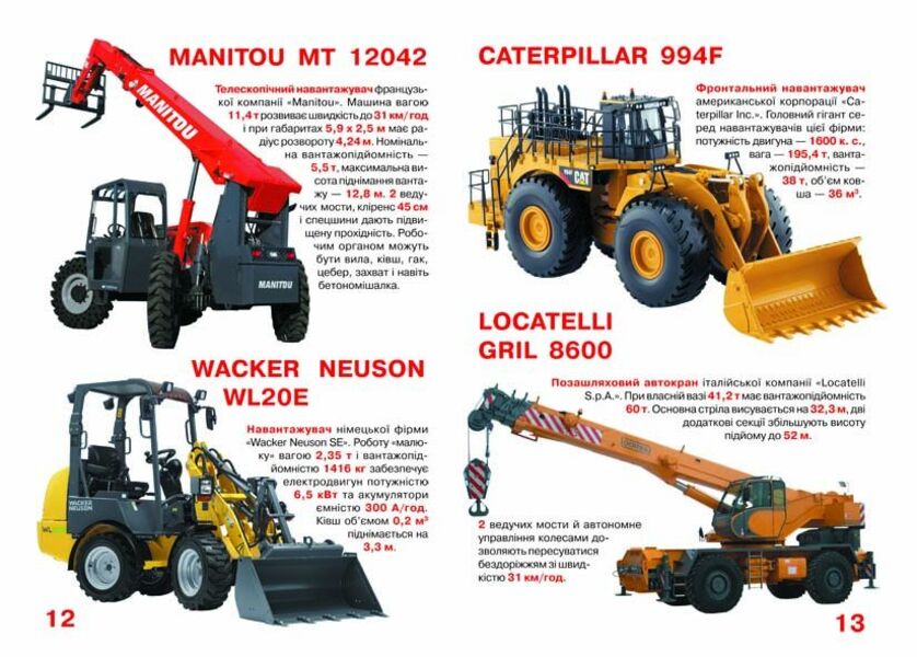 Ця книга розповість про різні моделі навантажувачів та кранів. Яскраві фотоілюстрації чудово доповнюють видання. Адресовано допитливим хлопчикам і дівчаткам, а також їхнім дбайливим батькам.
