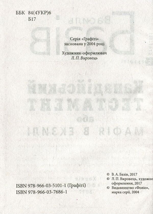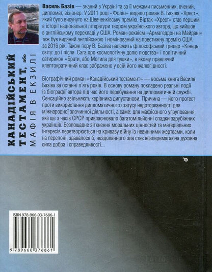 Василь Базів — знаний в Україні та за її межами письменник, вчений, дипломат, візіонер. У 2011 році 'Фоліо' видало роман В. Базіва 'Хрест', який було висунуто на Шевченківську премію. Відтак 'Хрест' став першим в історії національної літератури твором українського автора, що вийшов в англійському перекладі у США. Роман-реквієм 'Армагеддон на Майдані' був теж виданий англійською і номінований на престижну літературну премію США за 2016 рік. Також перу В. Базіва належить філософський трилер 'Кінець світу: до і після. Сага про космологічну долю людства' і політичний сатирикон 'Брати, або Могила для тушки', в якому правлячий клептократичний клас зображено у всій його жалюгідності.