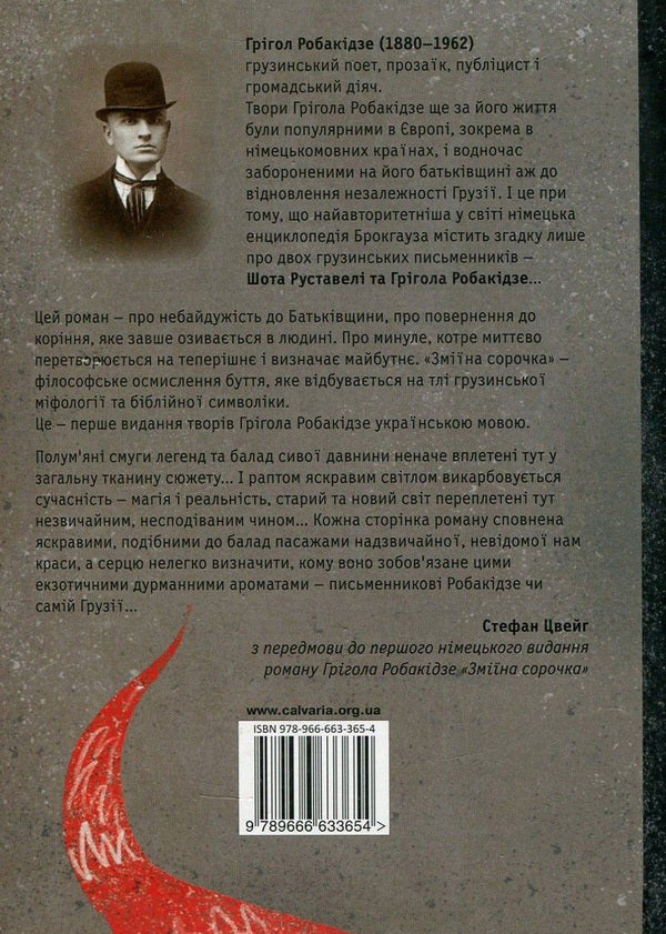 Од самого початку 'Зміїна сорочка' вражає: екскурси в історію давнього світу, бачення цього світу крізь призму століть в органічній єдності з сучасністю. У прозі Робакідзе заворожують відтінки, півтони психологічних взаємозв'язків та емоцій, виразність характерів і багатство стилю. Філософське осмислення сучасності через звернення до біблійної символіки, грузинської міфології та традицій викликає неймовірне захоплення.SPECIFICATIONS: