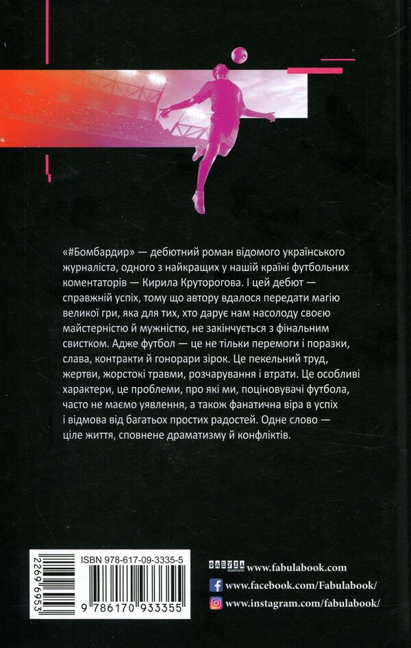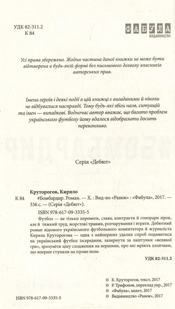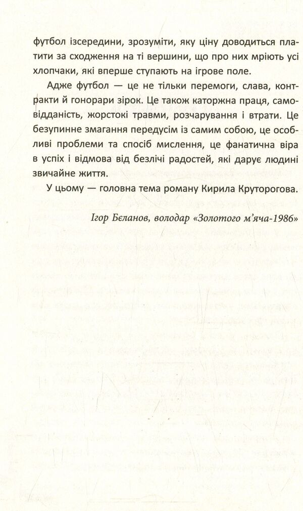 Футбол — не тільки перемоги, слава, контракти й гонорари зірок, але й тяжкий труд, жорстокі травми, розчарування і втрати. Дебютний роман відомого українського футбольного коментатора й журналіста Кирила Круторогова — одна з перших вдалих спроб подивитися на український футбол ізсередини, зазирнути за лаштунки 'великої гри', зрозуміти ціну сходження на вершини, про які мріють хлопчаки, що вперше ступили на ігрове поле.