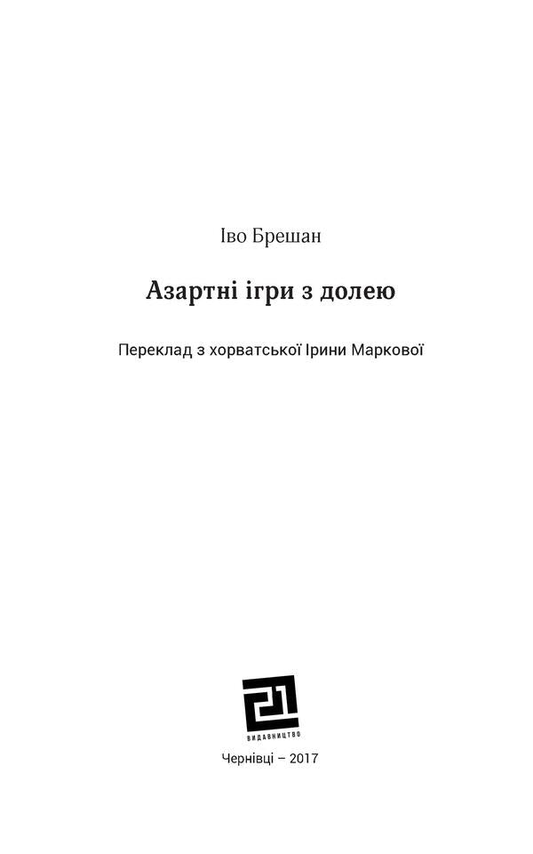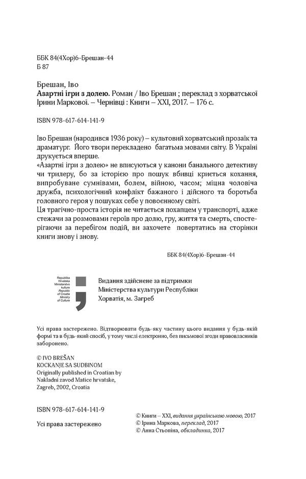 'Азартні ігри з долею' не вписуються у канони банального детективу чи трилеру, оскільки за історією про пошук вбивці криється кохання, випробуване сумнівами, болем, війною, часом; міцна чоловіча дружба, психологічний конфлікт бажаного і дійсного та боротьба головного героя у пошуках себе у повоєнному світі, що є особливо актуальним у нинішній історико-політичній ситуації в Україні.Ця трагічно-проста історія не читається похапцем у транспорті, адже стежачи за розмовами героїв про долю, гру, життя та смерть, спостерігаючи за перебігом подій, Ви захочете повертатись на сторінки книги знову і знову.SPECIFICATIONS: