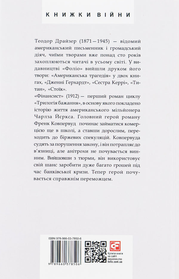 Головний герой роману Френк Ковпервуд починає займатися комерцією ще в школі, а ставши дорослим, переходить до біржових спекуляцій. І хоча його судять за порушення закону, і він попадає до в'язниці, герой анітрохи не почувається винним.Вийшовши з тюрми, він використовує свій шанс заробити дуже багато грошей під час банківської кризи. Тепер він почуває себе справжнім переможцем.SPECIFICATIONS: