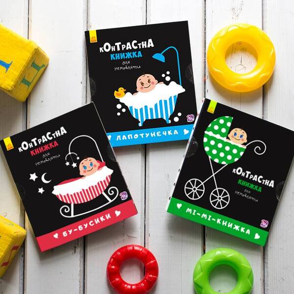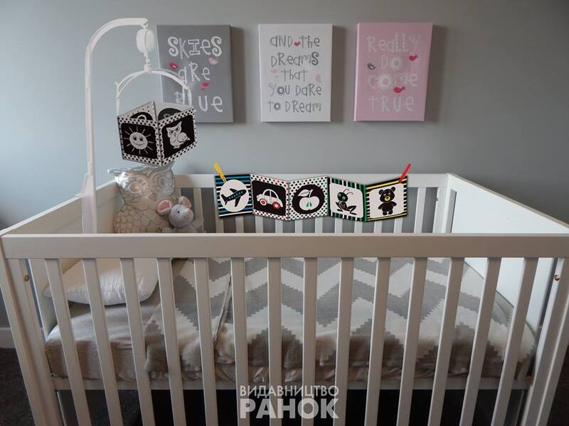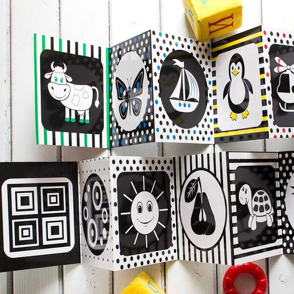 Книжка-прокладка для немовлят із чорно-білими картинками. Вона спеціально створена для розвитку і координації зору і сприйняття у малюків за популярною методикою Сесіль Лупан і Сари Брюер. Книга середнього розміру зі щільного картону. Вона ідеально підійде для розглядання картинок малюком у ліжечку. З одного боку розкладачки розташовуються чорно-білі картинки, з іншого боку - додається ще один колір.