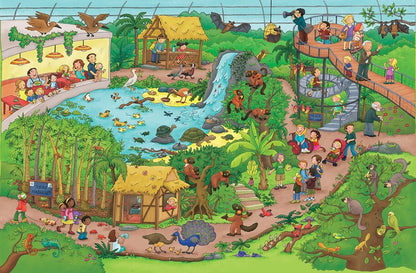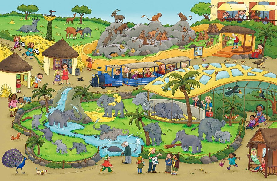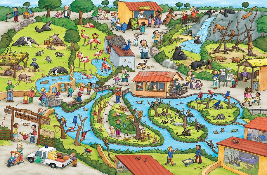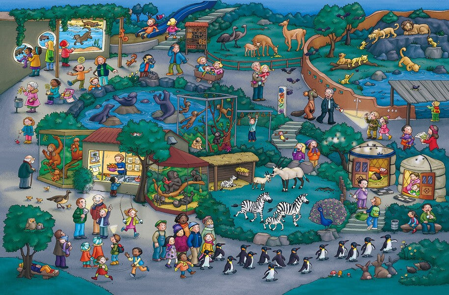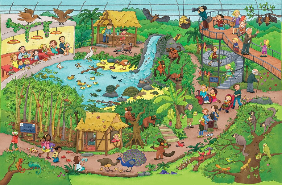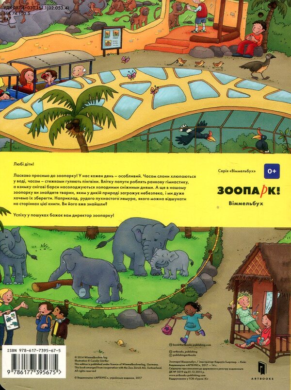 Прототипом зоопарку з книги є реальний зоопарк міста Цюріх, який проілюструвала німецький автор Каролін Гертлер. На сторінках книги маленьких читачів чекає все розмаїття тварин, птахів і рептилій, що живуть у зоопарку. Діти побачать, як крокують стежками зоопарку пінгвіни та проїдуться на ЗОО експресі. Вночі, тут можна переночувати в спеціальних будиночках, попередньо прогулявшись перед сном з ліхтариком і розглядаючи, як засинають звірі. На сторінках вімельбуха можна побачити, що відбувається в зоопарку взимку і влітку і познайомитися з найголовнішим героєм зоопарку – золотистим лемуром. Він зустрічає всіх біля входу і супроводжує на кожній сторінці книги, а на останньому розвороті в оранжереї тропіків Мадагаскару знайомить зі своєю родиною. Золотистий лемур – зникаючий вид, саме тому зоопарк Цюріху опікується цими тваринами.SPECIFICATIONS: