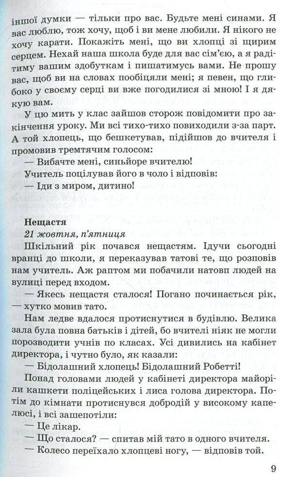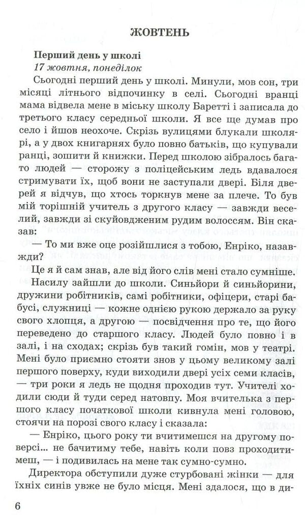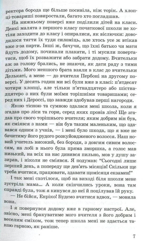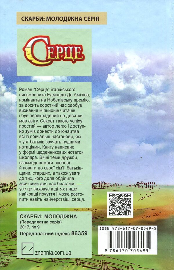 Книга “Серце” італійського письменника Едмондо де Амічіса (1846—1908) швидко завоювала прихильність читачів у всьому світі. Інакше й бути не могло, адже шкільні нотатки маленького третьокласника Енріко хоч спершу й видаються дещо наївними, та згодом глибоко розчулюють. У книзі поєднано щоденникові записи хлопчика, листи його батьків та оповідання вчителя, що зворушили юного головного героя та його однокласників. Стосунки з друзями, родиною, вчителями, чесність, героїзм, любов до батьківщини — наскрізні теми цієї оповіді, що здатні пробудити в дітях лише найкращі почуття.