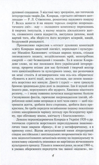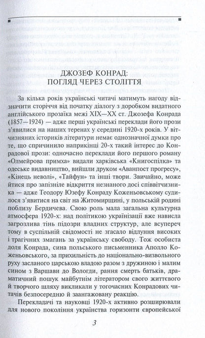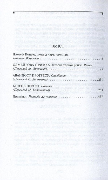 'Олмейрова примха' (1895) - перший роман Конрада, схвально прийнятий літературними критиками. У ньому автор з глибоким психологізмом змалював особисту трагедію людини, яка зневірилася у житті, у своїх найближчих людях, втратила будь-які ілюзії і врешті-решт загинула.В основу оповідання 'Аванпост прогресу' (1896) лягла подорож до Бельгійського Конго, зокрема, плавання до верхів'їв Конго, однієї з найвеличніших річок Африки.Повість 'Кінець неволі' (1902) належить до так званого 'епосу капітанів'. В образі капітана Уоллея Конрад втілив ідею особливого морського братерства, єдності відповідальних і чесних людей, виплеканих небезпечною морською професією.SPECIFICATIONS: