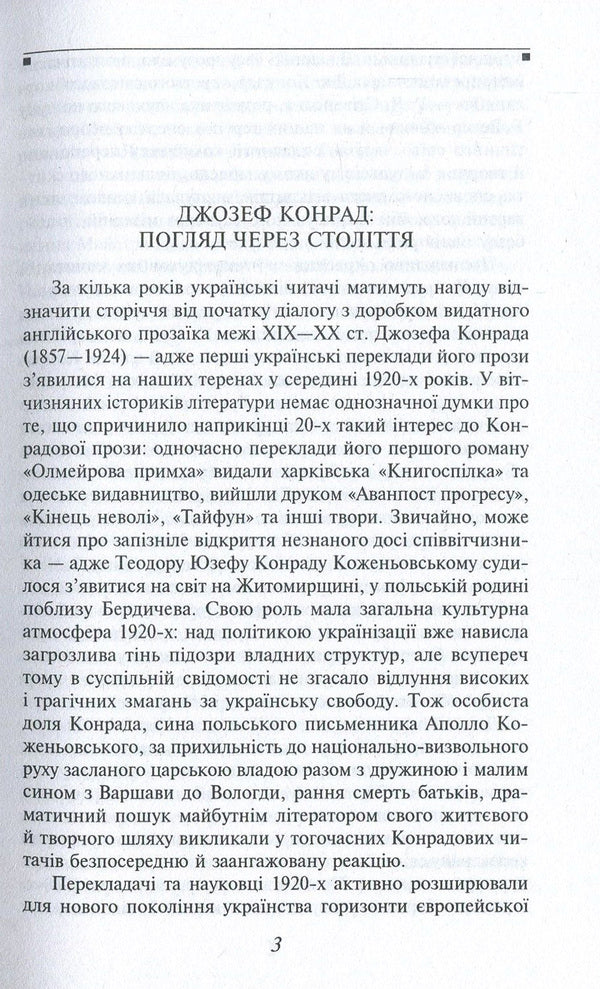 Джозеф Конрад (справжнє ім'я - Юзеф Теодор Конрад Коженьовський; 1857, Бердичів - 1924, Англія) - відомий письменник, поляк за походженням. автор захопливих романів про морські пригоди, класик англійської літератури. Він пройшов шлях від юнги до капітана торговельного флоту, добре знав життя й побут моряків і створив правдиві книжки, які ставлять поряд з 'Трудівниками моря' Віктора Гюго та 'Островом скарбів' Стівенсона.