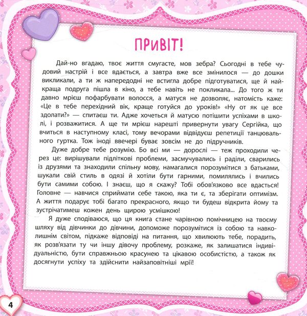 Ця чарівна книга стане помічницею кожній дівчинці, допоможе порозумітися із собою та навколишнім світом, підкаже відповіді на важливі питання, порадить, як розв’язати ту чи іншу дівочу проблему, розкаже, як залишатися індивідуальною, бути справжньою красунею та цікавою особистістю, досягнути успіху та здійснити найзаповітніші мрії.