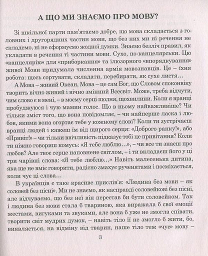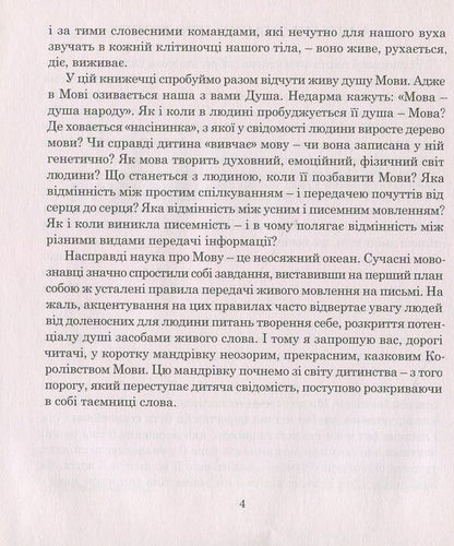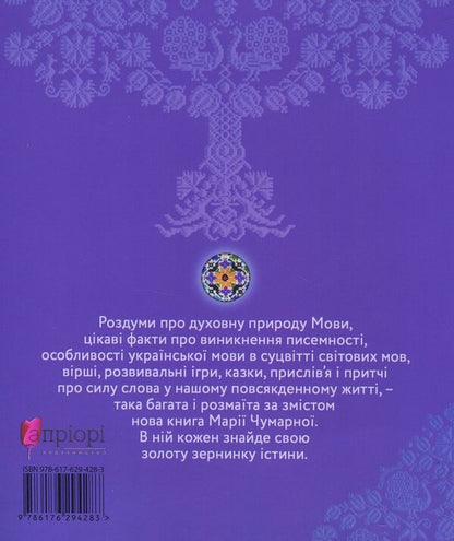 Роздуми про духовну природу Мови, цікаві факти про виникнення писемності, особливості української мови в суцвітті світових мов, вірші, розвивальні ігри, казки, прислів’я і притчі про силу слова у нашому повсякденному житті, – така багата і розмаїта за змістом нова книга Марії Чумарної. В ній кожен знайде свою золоту зернинку істини.