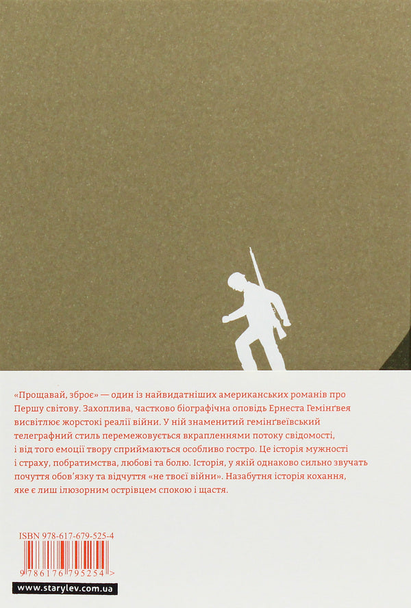 'Прощавай, зброє' - один із найвидатніших американських романів про Першу світову війну. Захоплива, частково біографічна оповідь Ернеста Гемінґвея висвітлює жорстокі реалії війни. У ній знаменитий гемінґвеївський телеграфний стиль перемежовується вкрапленнями потоку свідомості, і від того емоції твору сприймаються особливо гостро. Це історія мужності і страху, побратимства, любові та болю. Історія, у якій однаково сильно звучать почуття обов’язку та відчуття 'не твоєї війни'. Незабутня історія кохання, яке є лиш ілюзорним острівцем спокою і щастя.