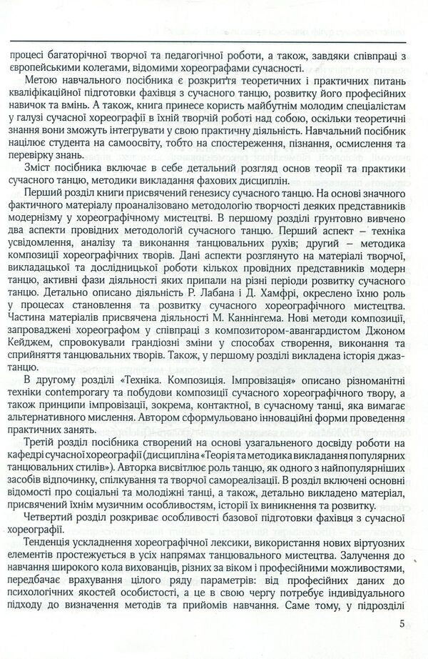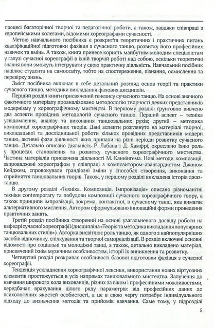 У навчальному посібнику розглядається широке коло питань щодо історії і теорії сучасного танцю, висвітлюються виконавське та балетмейстерське мистецтво, художньо-естетичні пріоритети західноєвропейських танцювальних шкіл, а також питання методики професійної підготовки фахівця.