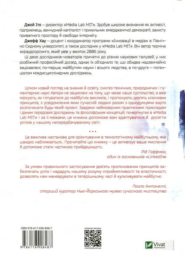 Цілком новий погляд на знання й освіту, синтез технічних, природничих і гуманітарних наук! Автори не зациклені на тому, що чекає наше суспільство, а вже міркують, як готуватися до майбутніх викликів, і пропонують дев’ять основних принципів, з усвідомлення яких сучасній людині разом з однодумцями варто розпочинати будь-який проект. Завдяки неймовірним практичним прикладам і даним передових досліджень та філософських концепцій, почерпнутих в Media Lab MIT і за її межами, ця книжка допоможе вам адаптуватися й досягти успіхів у нашому непередбачуваному світі.