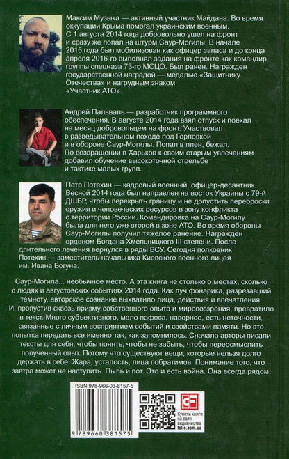 Саур-Могила... необычное место. Но эта книга не столько о местах, сколько о людях и событиях августа 2014 года. Как луч фонарика, брошенного в темноту, сознание авторов выхватило лица, действия и впечатления. И, пропустив через призму собственного опыта и мировоззрения, превратило в текст. Много субъективного, мало пафоса, наверное, много неточностей, связанных с личным восприятием событий и свойствами памяти. Но это попытка передать все именно так, как запомнилось.