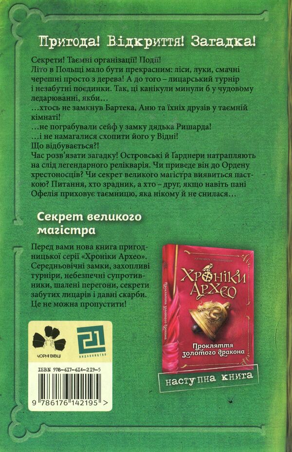 “Секрет великого магістра” ‒ книга-квест, що занурює книголюбів у часи Середніх віків, наповнені небезпекою, загадками та випробуваннями. У супроводі сміливих і допитливих героїв читачам випаде нагода дізнатись історію відомого лицарського ордену, таємниці якого здивують і підлітків, і їхніх батьків.