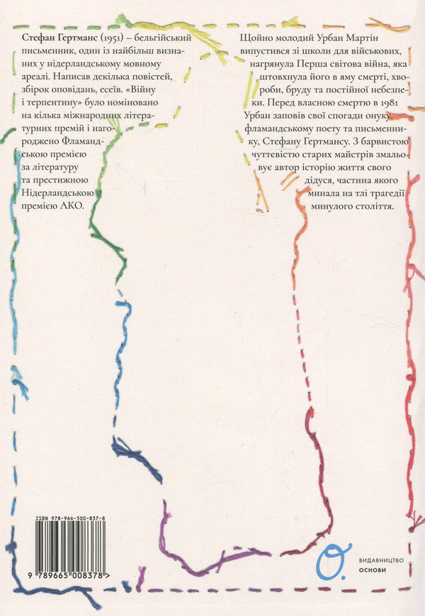 Перечитавши щоденники дідуся Стефан Гертманс, один з найпопулярніших сучасних бельгійський письменників, вирішив створити книгу. 'Війна і Терпентина' вийшла друком у 2013 році, з цього часу роман став популярним у 16-ох країнах світу, а видання The Guardian пророкує, що книжка стане майбутньою класикою.SPECIFICATIONS: