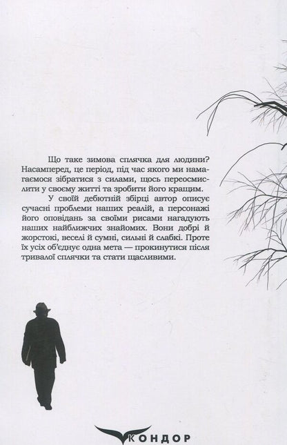У своїй дебютній збірці автор описує сучасні проблеми наших реалій, а персонажі його оповідань за своїми рисами нагадують наших найближчих знайомих. Вони добрі й жорстокі, веселі й сумні, сильні й слабкі. Проте їх усіх об’єднує одна мета — прокинутися після тривалої сплячки та стати щасливими.SPECIFICATIONS: