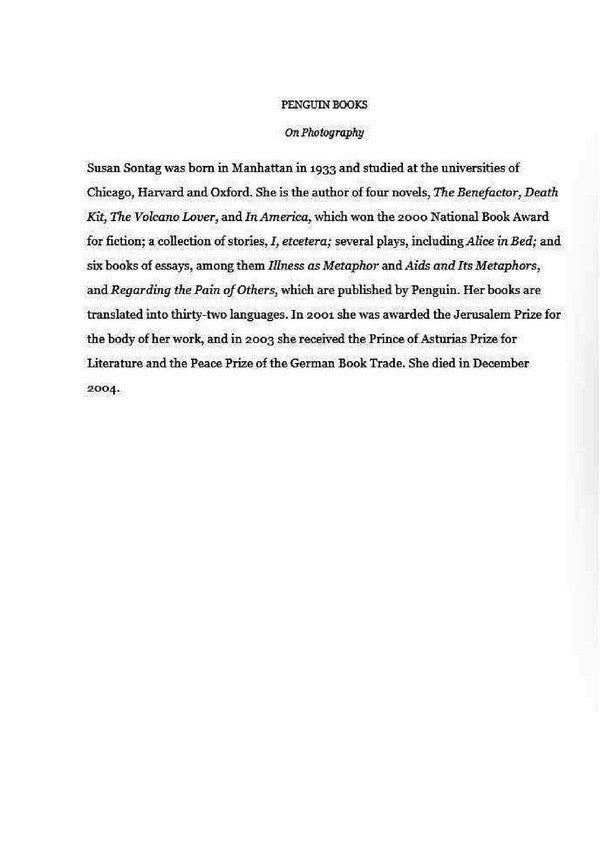One of America's best-known and most admired writers, Susan Sontag was also a leading commentator on contemporary culture until her death in December 2004. Her books include four novels and numerous works of non-fiction, among them Regarding the Pain of Others, On Photography, Illness as Metaphor, At the Same Time, Against Interpretation and Other Essays and Reborn: Early Diaries 1947-1963, all of which are published by Penguin. A further eight books, including the collections of essays Under the Sign of Saturn and Where the Stress Falls, and the novels The Volcano Lover and The Benefactor, are available from Penguin Modern Classics.