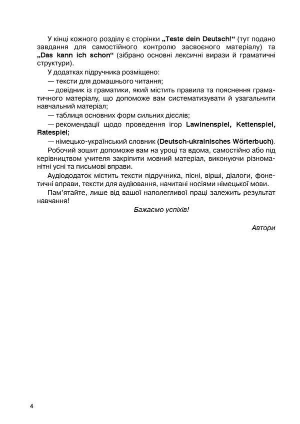 Підручник складається з семи тематичних розділів, які містять комунікативно спрямовані навчальні матеріали (лексику, граматику), систему завдань і вправ для розвитку всіх видів мовленнєвої діяльності учнів (слухання, говоріння, читання, письма), завдання для самостійного контролю здобутих знань, рубрику для допитливих. Наприкінці підручника подано німецькоукраїнський словник, довідкові матеріали. Малюнки, фотографії, на яких представлені реалії сучасної Німеччини й України, таблиці, схеми разом із текстами сприятимуть кращому засвоєнню німецької мови як другої іноземної, розвиткові пізнавальних та інтелектуальних, творчих здібностей восьмикласників.Для учнів, учителів, методистів, батьків.SPECIFICATIONS: