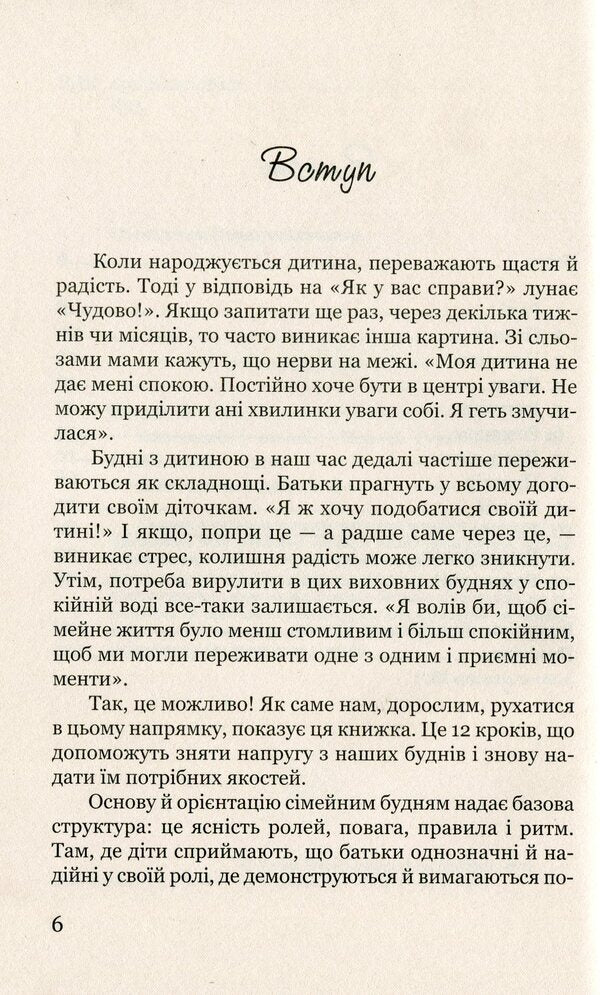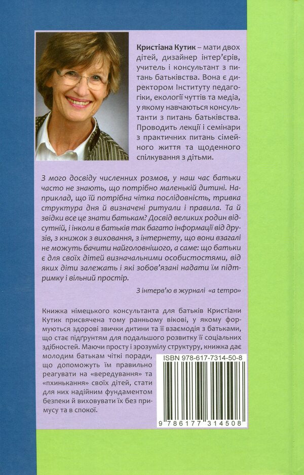 Книжка німецького консультанта для батьків Кристіани Кутик присвячена тому ранньому вікові, у якому формуються здорові звички дитини та її взаємодія з батьками, що стає підґрунтям для подальшого розвитку її соціальних здібностей. Маючи просту і зрозумілу структуру, книжка дає молодим батькам чіткі поради, що допоможуть їм правильно реагувати на 'вередування' та 'пхинькання' своїх дітей, стати для них надійним фундаментом безпеки й виховувати їх без примусу та в спокої.